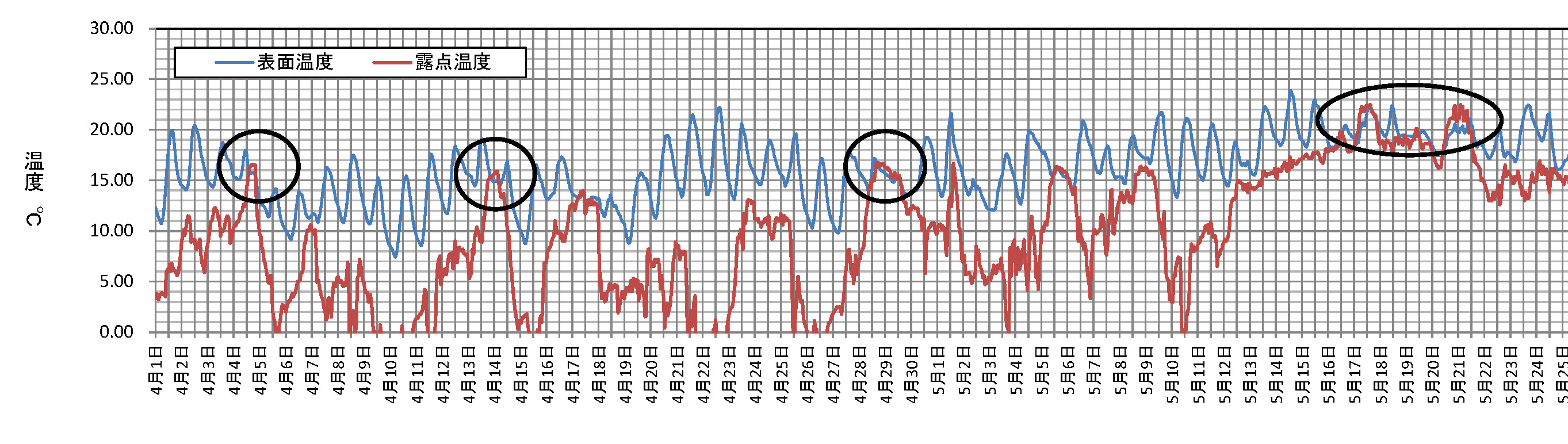 | 結露判断 | 床表面温度と露点温度を算出して、露点温度が床表面温度を超えた場合結露発生とします。 (下図の〇の箇所で結露が発生) |